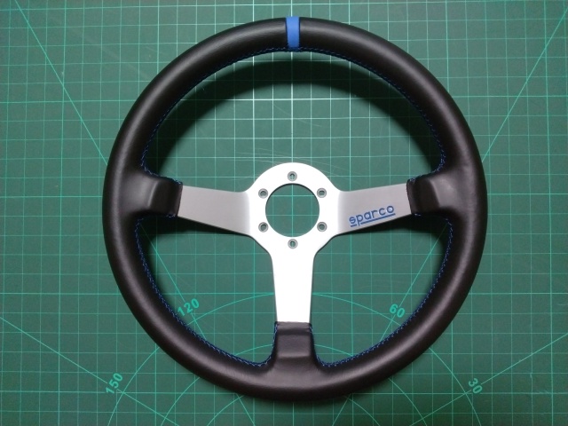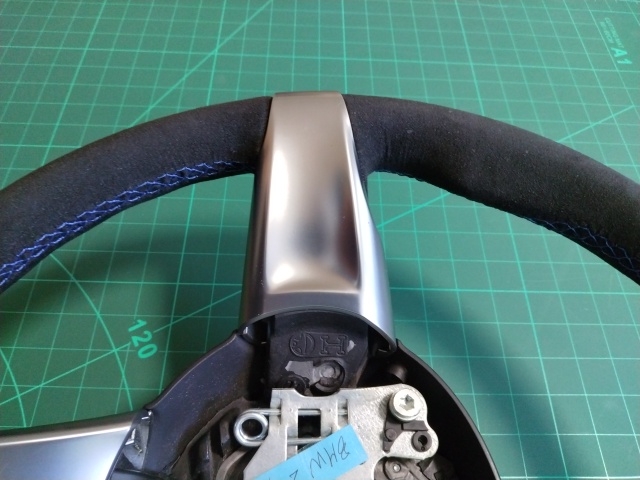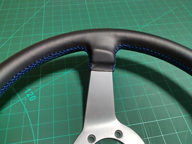 ・レヴォーグ<特別加工巻替、革巻:現状重巻太巻仕上げですが上部継ぎ目位置及び角度変更の為、下地革の継ぎ目が表面に出ない様に当該部位の下地革を張替&センターマーカー(AL青+溝加工)&上下AL黒&左右DP黒&一目飛(青糸)仕様です。>