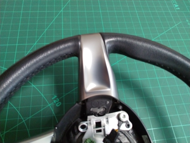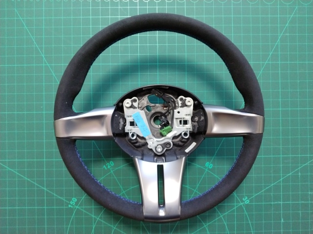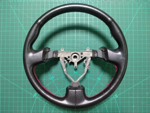・インプレッサスポーツ<4分割巻巻替:上下AL黒&左右DP黒&V(赤糸)仕様です。>~現状、表皮の薄皮が剥がれてしまった合皮製ハンドルを本革にて巻き替えです。